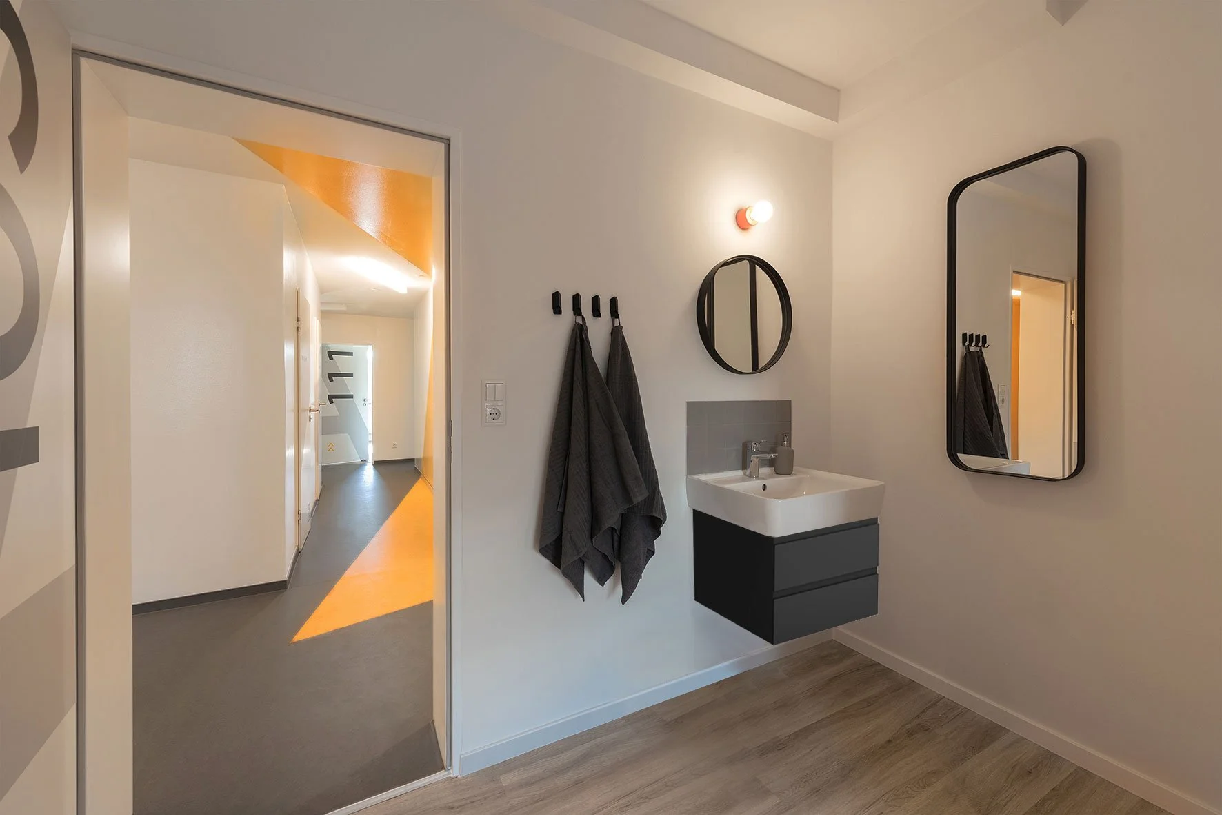 Dieses Doppelhochhaus kennt ganz Bochum: 11 Stockwerke mit papageienbunter Wellblechverkleidung. Darin eine große bunte Gesellschaft junger Menschen aus verschiedensten Kulturen. Dazu passt das neue Farbkonzept: ein wenig schrill, gleichzeitig Struktur schaffend, klar und hell. Auf neutralem Anthrazit und Weiß leuchtet ein Regenbogenfarben-Kaleidoskop von Limettengrün bis Pink. Jede Etage hat ihre Farbe, die Dimensionen öffnet und Richtung weist. Die über 500 Zimmer bieten Gemütlichkeit auf kleinstem Raum.